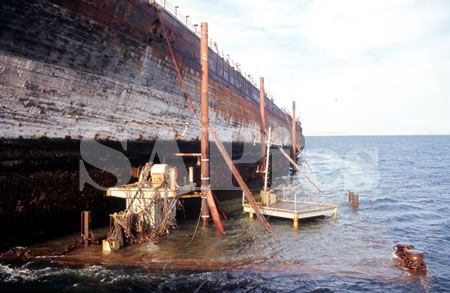 The pontoon Mulus III re-emerges from the ocean with the hulk of the Great Britain secured between the 'dolphins'. The date was April 13, 33 years to the day she was beached in Sparrow Cove in 1937.