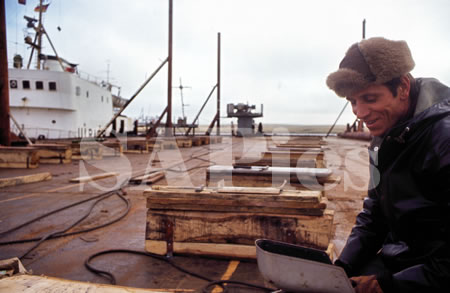 A member of the German crew working on the pontoon Mulus III before it was submerged. Two rows of wooden blocks were fixed to either side of the platform on which the hulk would sit.