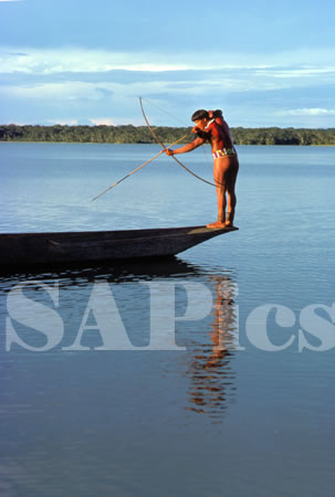 Brazil. The Kayapó (also known as the Xikrin and Txhukahamai) fishing with a bow and arrow in the River Xingu, Para state.