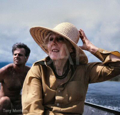 | © Margaret Mee on the Rio Negro,Brasil, May 1st 1988 Here with her famous hat in the picture which has become iconic. Behind her Gilberto Castro a long time friend is controlling the outboard motor of his tiny boat | ||||||||||
